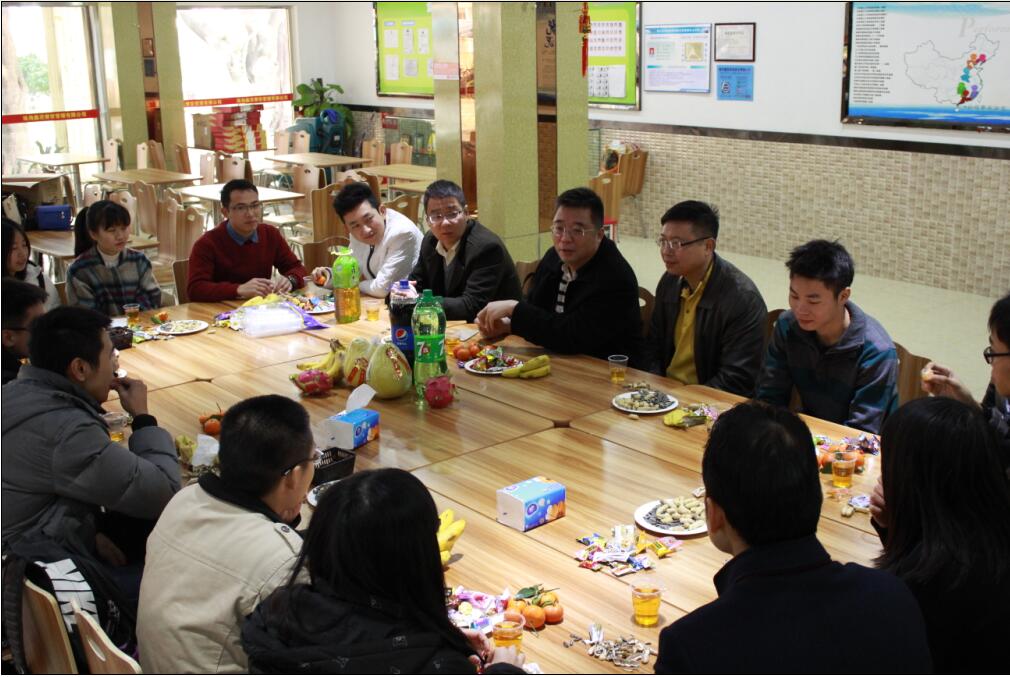 三羊開泰辭舊歲,金猴獻瑞賀新春。2016年2月6日中午,學校在第一食堂張燈結彩舉行寒假留校學生新春團拜會。黨委副書記李靄康、學生處處長許皓,信息工程學院副書記李奎華、機電工程學院副書記常勝濤、輔導員卓英蓮、王甜子以及學生處老師,同12名留校學生歡聚一堂,喜迎新年。