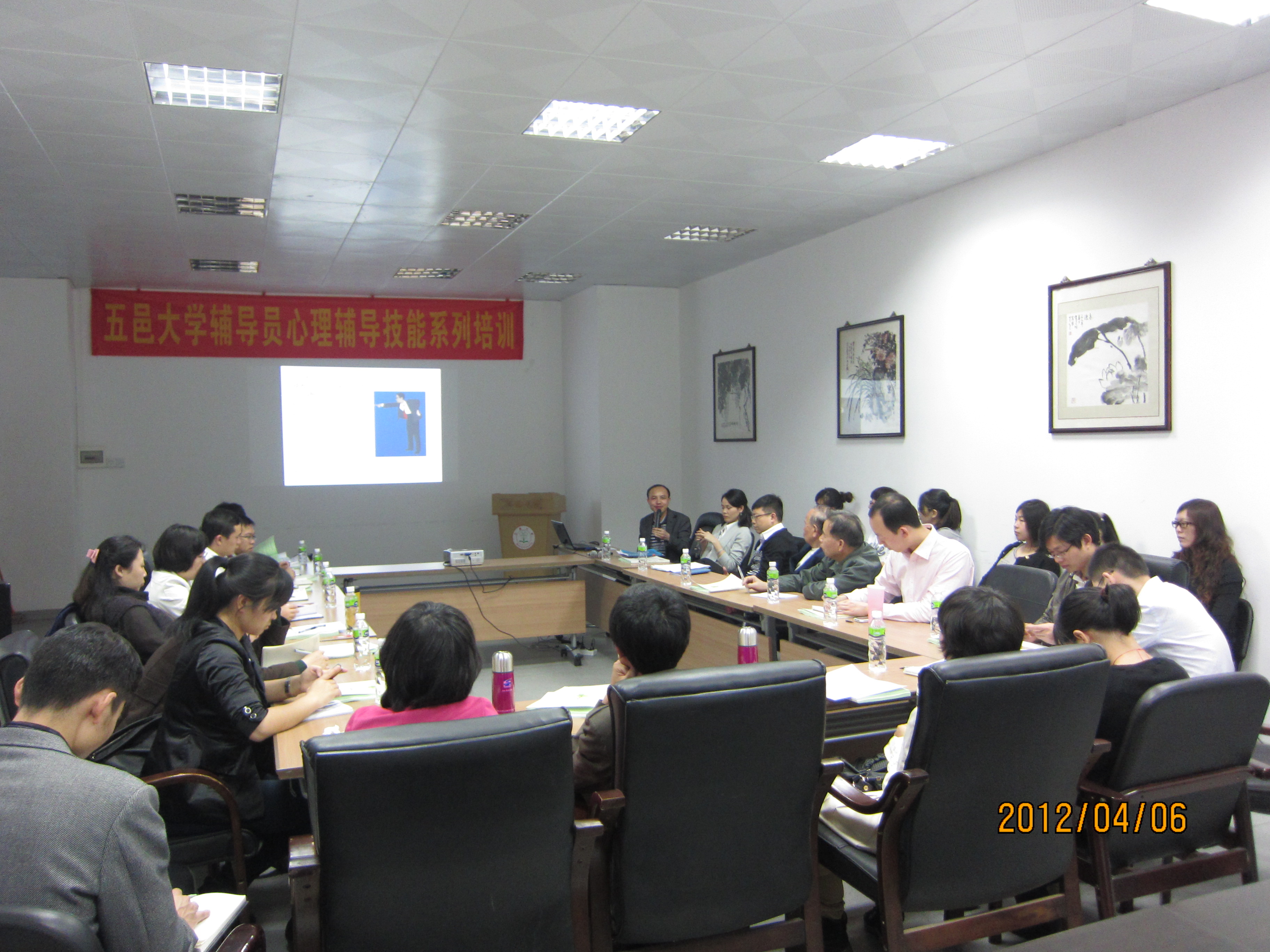 為提高我校輔導員心理輔導技能,提升輔導員工作科學化水平,4月6號下午3點,我校在主樓就業洽談室舉行2012年輔導員心理輔導技能首期培訓,學生處處長許皓同志、校關委副主任關福漢老師、全體輔導員老師、學生處全體人員參加了培訓。心理健康教育中心的項傳軍老師和傅蓉老師擔任主講。