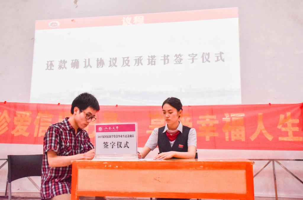 會(huì)上,雷凌宇先生作了《大學(xué)生征信知識(shí)知多少》講座,他從“誠(chéng)信”與“征信”的區(qū)別入手,引用真實(shí)案例,解釋征信對(duì)個(gè)人的重要性,提醒大學(xué)生謹(jǐn)防信用卡陷阱、養(yǎng)成良好信用習(xí)慣、關(guān)心個(gè)人信用記錄、堅(jiān)決不做違反國(guó)家金融法規(guī)的事情。隨后,學(xué)生代表經(jīng)濟(jì)管理學(xué)院陳翠梅同學(xué)發(fā)言,陳翠梅同學(xué)目前已收到銀行聘用通知,她代表廣大受助學(xué)生真誠(chéng)感謝國(guó)家助學(xué)貸款幫助貧寒學(xué)子圓夢(mèng)大學(xué),并鄭重承諾,將按時(shí)還清貸款,不辜負(fù)銀行的信任和學(xué)校的培養(yǎng)。廣發(fā)銀行尹舒敏女士對(duì)還款方式進(jìn)行了介紹,并詳細(xì)說(shuō)明填寫《還款協(xié)議書》的注意事項(xiàng)。最后,計(jì)算機(jī)學(xué)院陳忠藝同學(xué)代表2017屆國(guó)家助學(xué)貸款畢業(yè)生上臺(tái)與銀行簽訂《還款協(xié)議書》及《還款承諾書》。