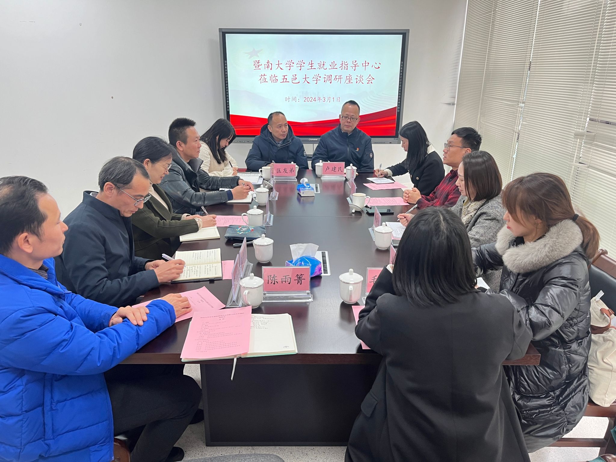 3月1日下午,暨南大學學生就業指導中心主任李楊,副主任黃曉華,學生就業指導中心老師李秀林、姜紫薇、毛詩宜一行5人蒞臨我校交流座談。暨南大學駐五邑大學幫扶團隊盧健民、匡友弟,五邑大學黨委學生工作部(學生處)部長(處長)李華、黨委學生工作部(學生處)副部長(副處長)、就業指導與服務中心主任柯曉偉、文學院黨委副書記李奎華、數學與計算科學學院黨委副書記卓英蓮、紡織科學與工程學院黨委副書記陳旭華、就業指導與服務中心工作人員陳雨箐出席會議。