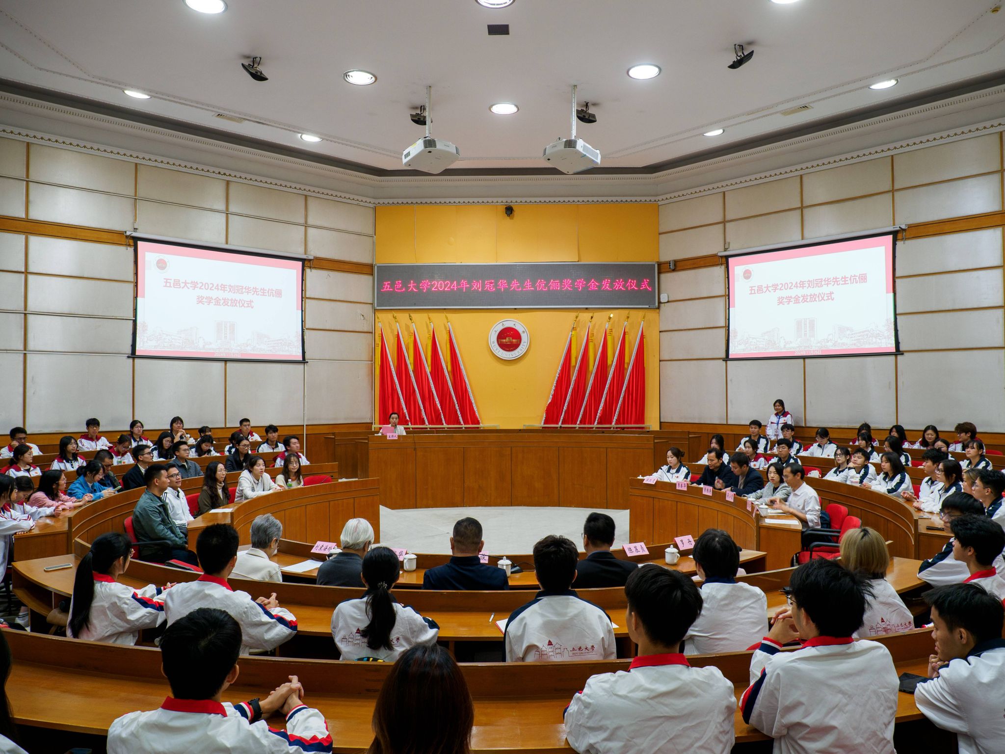 11月26日,我校在十友樓二樓國際會議廳舉行2024年劉冠華先生伉儷獎學金發放儀式。旅美臺山籍金融家、美國摩根大通銀行前副總裁、五邑大學第三屆董事會常務董事劉冠華先生和夫人劉袁海玲女士,五邑大學副校長董超俊,黨委統戰部、僑務辦公室、黨委學生工作部(學生處)負責人,各學院黨委副書記、輔導員代表、全體獲獎學生以及各學院學生代表參加活動。儀式由黨委學生工作部(學生處)部(處)長羅丹主持。