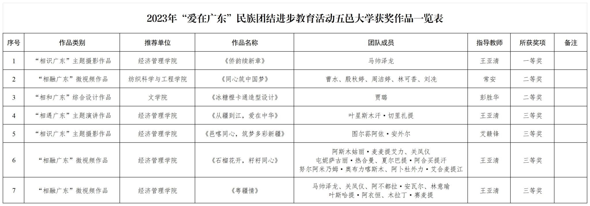 在社會實踐紀實類獲獎作品中,《啟超文化,傳承有我》榮獲全省二等獎,《打造文旅融合新 IP,擦亮“啟超故里,陳皮之鄉”城市名片》榮獲全省三等獎;在講述誦讀類獲獎作品中,《“鄉”約今夏,繁星逐夢》榮獲全省一等獎,《青春逢盛世,奮斗正當時》榮獲全省二等獎,《閃光的青春,奮斗的華章》榮獲全省三等獎;在歌曲傳唱類獲獎作品中,《我喜歡·邑大易班》《天耀中華》《星辰大海》榮獲全省三等獎;在主題攝影類獲獎作品中,《用翰墨架起中馬學生友誼橋》榮獲全省三等獎;在公益廣告類獲獎作品中,《強國有我,青春有為》榮獲全省三等獎;在工作案例類獲獎作品中,《知行合一,構建“四維四驅動”實踐育人工作模式——以“紅樹林碳匯及水生態調研”社會實踐項目例》榮獲全省三等獎。
