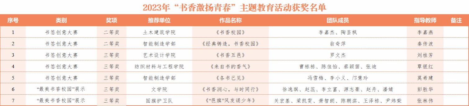 在廣東高校網絡思想政治工作中心、廣東高校易班發展中心、“南粵易班”學風傳承示范基地聯合舉辦的2023年“書香激揚青春”主題教育活動中,土木建筑學院推薦的作品《書香校園》、智能制造學部推薦的作品《經典鑄造,書香校園》榮獲書簽創意大賽類別二等獎,藝術設計學院推薦的作品《書香五邑》、紡織材料與工程學院推薦的作品《來自書的香氣》、智能制造學部推薦的作品《各書己見》榮獲三等獎。文學院推薦的作品《書香潤心,與時同行》與學校國旗護衛隊推薦的作品《“邑旗”風發誦少年》榮獲“最美書香校園”展示類別三等獎。通過舉辦本次比賽活動,切實在校園中營造愛讀書、讀好書、善讀書的良好風氣,助力學校優良學風建設。