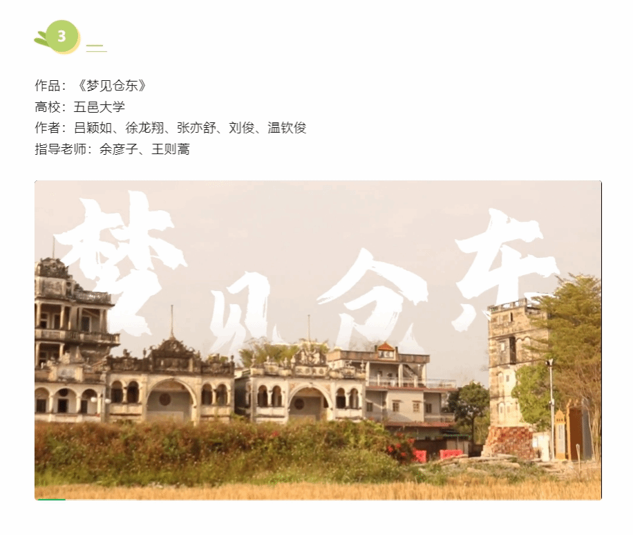 在廣東高校“僑鄉有約 傳承有我”僑鄉文化微視頻征集活動中,由我校推薦的余彥子、王則蒿老師指導,呂穎如、徐龍翔、張亦舒、劉俊、溫欽俊5名同學參與創作的作品《夢見倉東》榮獲一等獎,并在廣東高校網絡思想政治工作中心平臺面向全省展播。此外,我校推薦的作品還榮獲二等獎5項,三等獎2項,優秀獎1項。