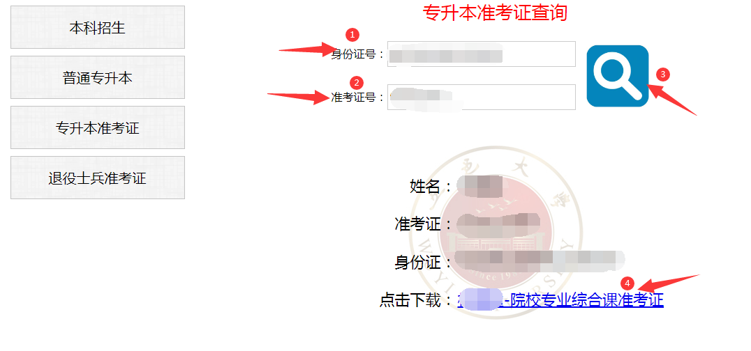 點擊以上地址,進入查詢頁面,輸入個人身份證號、準考證號(省報名系統生成的10位考生號),點擊查詢按鈕。查詢到個人準考證信息后,點擊下載準考證的鏈接,進行下載打印。